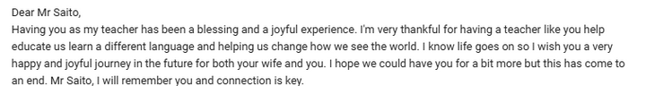 "Harrison Saito is a man who doesn't stop at anything to find truth within himself. His relentless pursuit for understanding the life we live in is one that I've never seen before and has inspired me to look deeper within myself. Even within that one statement of 'looking deeper within' is one that Harrison could dissect, bringing forward a complex/intertwined discussion of many perspectives and simplifying it for anyone to understand. He instilled within me the importance of English as a subject, not just in my schooling experience but in being able to expand on my ability to understand the complexity within situations.On a more personal level, Harrison has been one of my greatest mentors. He is kind, understanding, empathetic and someone that I have always gone to whenever I need advice. On top of this, he is one of the hardest workers I have seen, whether this be in his personal growth or daily life."